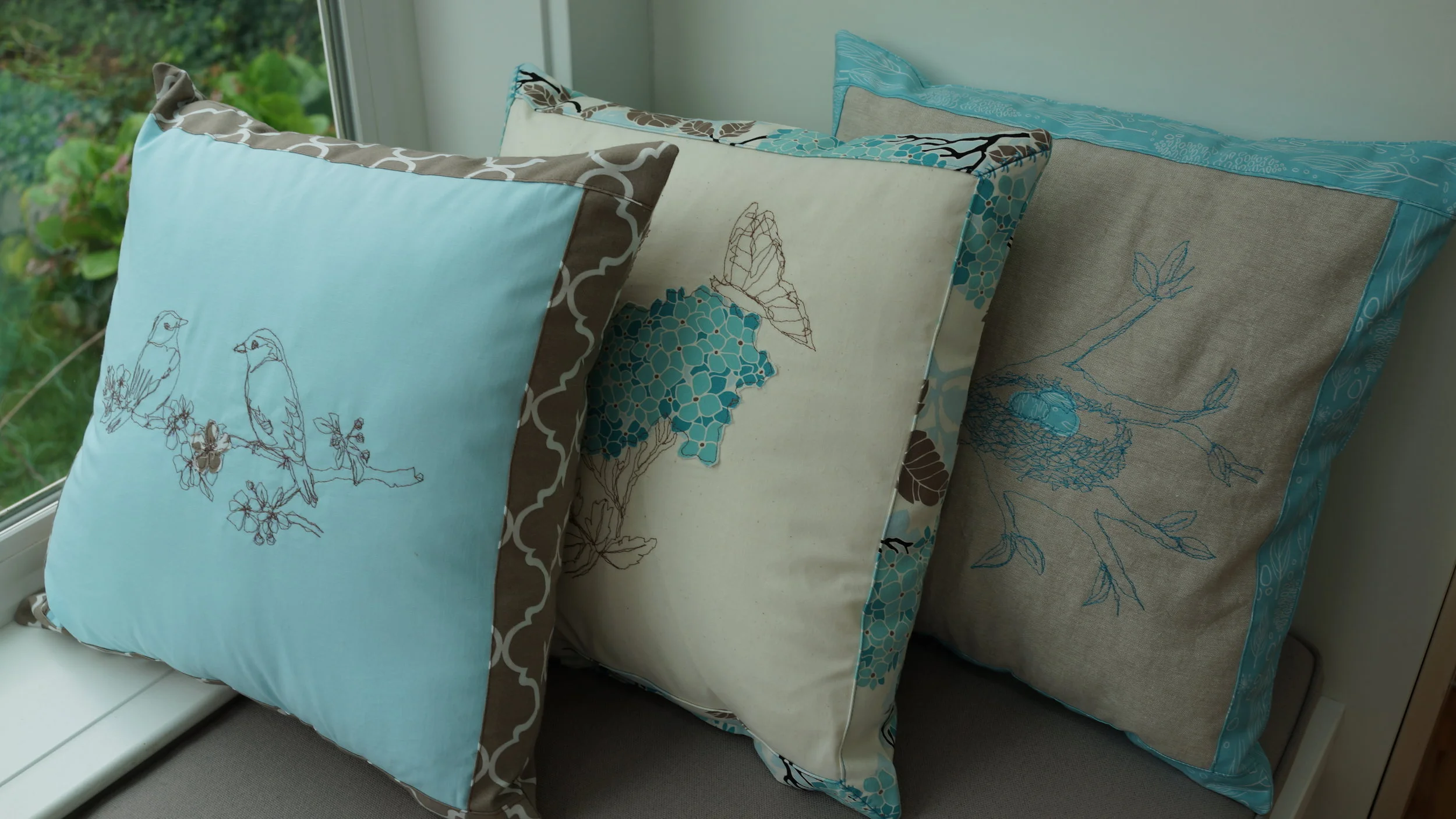 My first pillow, "Royal Hydrangea," featured two butterflies flitting around a hydrangea. The next was entitled "Birds of a Feather," with two birds perched upon an apple blossom branch. The final pillow design, "Robin's Nest," featured three tiny blue eggs in a nest perched high upon the branches of a tree.